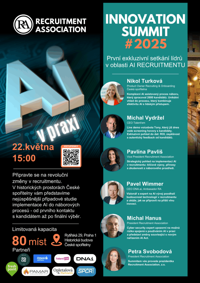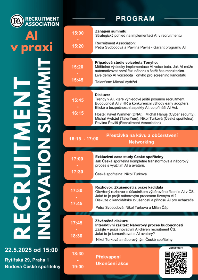 - Diskuze s odborníky – čekají vás inspirativní case studies i otevřená diskuse o budoucnosti AI v recruitmentu.